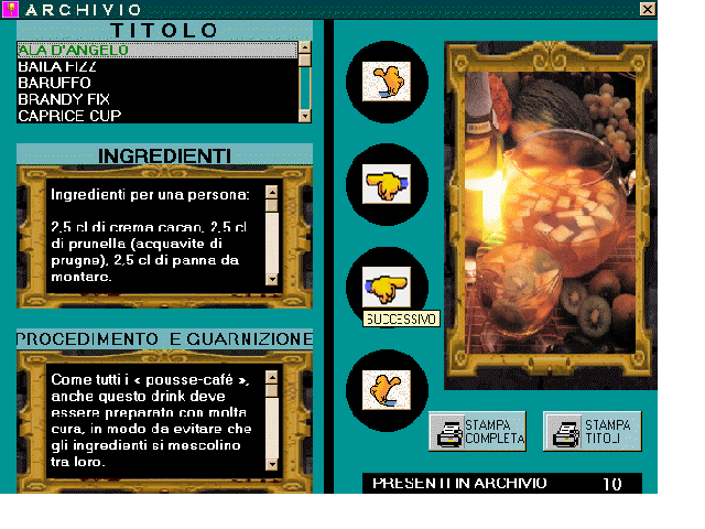 Tutte le altre funzioni sono abilitate, le uniche limitazioni consistono nel poter visualizzare solo alcuni cocktail (solo 80) delle categorie whisky, gin, misti, aperitivi, digestivi, dissetanti e qualche ricetta stuzzichevole da servire con i coktail (estrapolate dal mio programma LA BUONA CUCINA V.1.1 / 98 con 1700 ricette per tutti i gusti), tutte le altre funzioni sono disponibili; invece nella versione completa sono presenti quasi 2000 cocktails suddivisi per tutte le categorie e non vi è limitazione nel memorizzare le proprie preparazioni personali.