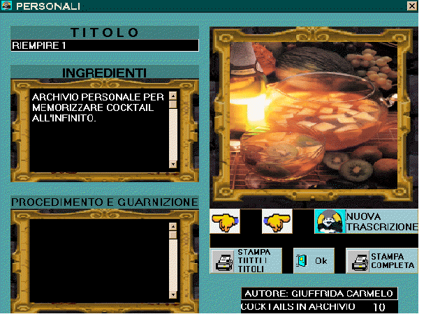 Salve mi chiamo GIUFFRIDA CARMELO, sono un programmatore alle prime esperienze e o creato questo software "IL BARMAN INFORMATIZZATO" con inserito quasi 2000 COCKTAIL e con possibilità infinite di inserirni altri.