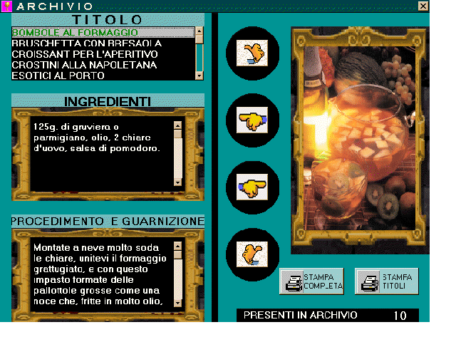 Il presente software è una versione SHAREWARE e può essere utilizzato indistintamente sia da singole famiglie che da bar, ristoranti ecc. i quali vogliono archiviare, ricercare, stampare le proprie preparazioni con estrema facilità, eliminando cosi ingombranti libroni o fastidiosi appunti trascritti o staccati dai vari quotidiani.