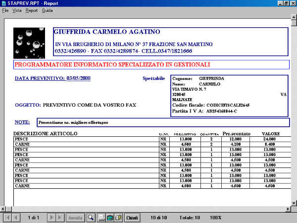 (OPZIONE "GESTIONE PREVENTIVO") Alla gestione si accede cliccando sul tasto omonimo presente nel menu principale, il quale accede alla scheda scelta cliente, quindi selezionarlo e trascrivere i dati oggetto della fornitura e note per il preventivo; cliccando poi sul pulsante procedi si accede nella scheda dove si scelgono gli articoli che devono essere inseriti nel preventivo, in tale scheda si deve trascrivere la quantità per articolo, eventuale sconto e I.V.A. se diversa da quello preimpostato e dopo di che cliccare sul tasto memorizza (se si dispone di una scheda sonora, si udirà un messaggio di conferma della memorizzazione) e poi procedere cosi con tutti gli articoli da inserire nel preventivo. E anche possibile avere l'anteprima parziale o completa del preventivo che si sta creando con i relativi importi.