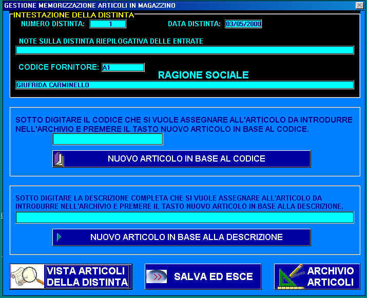 g) l'archivio dei fornitori, i quali si possono aggiornare anche in fase di introduzione articoli. (si raccomanda di assegnare un codice fornitore univoco)