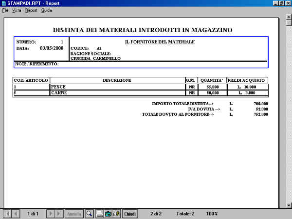 i)-STAMPA DISTINTE- Consente di stampare le stampe delle distinte dei materiali introdotti in magazzino con le relative etichette (USARE ETICHETTE ADESIVE AVERY 7651).