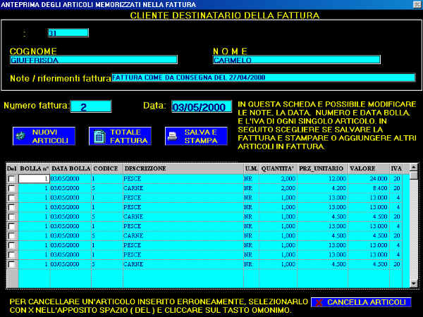 A) CONSEGNE ARTICOLI AI CLIENTI- In questa fase di consegna articoli e possibile selezionare e aggiornare gli articoli in uscita con controllo sulla quantità disponibile in magazzino, naturalmente il programma segnala se la quantità che si vuole consegnare al cliente e inferiore alla disponibilità in magazzino non permettendo di procedere all'archiviazione. Tutta la gestione e autoguidata con possibilità in tempo reale di modifica degli articoli selezionati e memorizzati. Dopo la selezione e memorizzazione degli articoli e possibile stampare le bolle di consegna (OPZIONE STAMPE LE BOLLE)e in tutti i casi e anche possibile richiamare la bolla memorizzata per eventuali aggiunte o modifiche (MODIFICA BOLLE. (Si rammenta che lo sconto all'articolo può essere applicato a piacere)