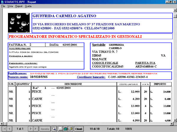 N.B. La fattura creata si può spedire al cliente anche tramite fax se si dispone di un modem: quando si vuole inviare la fattura tramite fax bisogna impostare il fax come stampante predefinita di windows e poi sceglierla dalla finestra di dialogo che compare al momento della stampa.