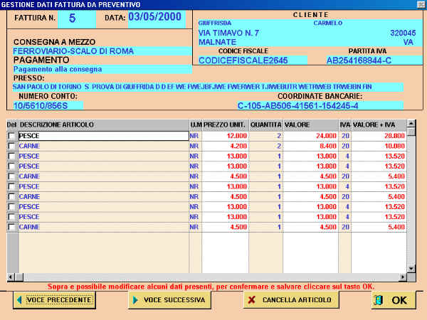 a) "FATTURA DA PREVENTIVO" Possibilità di aprire un preventivo salvato e trasformarlo in fattura, cliccando sul pulsante omonimo presente nel menu principale, vi sarà chiesto la banca d'appoggio per il pagamento della fattura e il preventivo che vorrete convertire e dopo un'anteprima si può salvare e stampare.